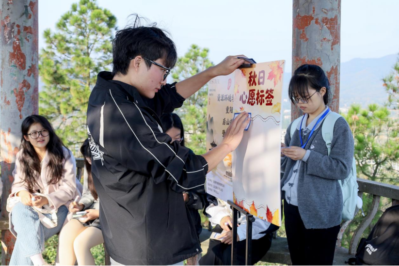 活动特别选址校园后山与文曲亭,将课堂教学延伸至自然天地,开创传统文化育人新模式。“我们想让重阳这一传统节日‘活’起来,避免它仅停留在‘敬老’的概念认知上。”活动负责人、地理科学2024(2)班的付松表示,希望通过“后山登高”这一沉浸式体验,将节日习俗与校园自然场景结合,既符合“登高祈福”的传统,又能让学生们在户外互动中切身感受节日氛围。